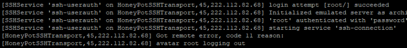 La majorité des journaux d’événements de Cowrie contiennent ce type d'informations. Lorsqu'une authentification réussit, la plupart du temps, le robot qui effectue cette authentification se déconnecte immédiatement.