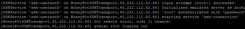 Le service SSH proposé par Cowrie est particulier, celui-ci journalise toutes les tentatives d'authentification, mais y intègre également le mot de passe saisi par l'attaquant (ce qui n'est pas le cas du service SSH standard bien entendu). Les plus attentifs remarqueront que plusieurs "attempt succeeded" apparaissent pour les tentatives de connexions avec l'utilisateur root. En effet, le service SSH Cowrie accepte plusieurs mots de passe valides pour un même compte (et faibles en plus ...). Encore une fois, l'idée est d'avoir un service faiblement protégé afin de piéger l'attaquant, peut importe donc quel mot de passe il utilise.