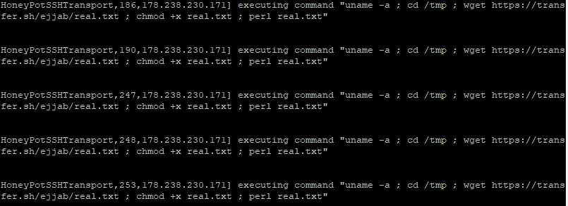Le fait que la même commande soit présente plusieurs dizaines de fois indique qu'il ne s'agit pas de l'action d'un humain, mais plutôt d'un robot. Celui-ci ne s'est toutefois pas contenté d'une authentification réussie, il a tenté de télécharger et d'exécuter un programme perl avec la commande suivante :
