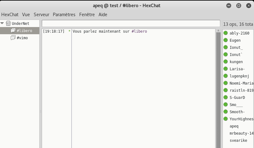 Je parviens au bout de plusieurs essais à me connecter au serveur du botnet, qui est assez désert. Les deux channels proposés ne possèdent pas plus de 20 utilisateurs connectés :