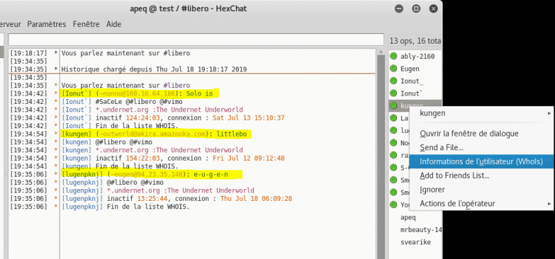 Chose intéressante, je peux découvrir l'adresse IP des serveurs compromis grâce à la fonction de recherche d'informations proposée par IRC :