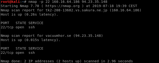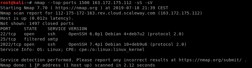 Deux services SSH et rien d'autres ? Voilà qui est étrange. Dans un cas réel, il conviendrait d'avoir un serveur qui paraisse un peu plus légitime (avec des services métier) et d'éviter d'exposer publiquement le service SSH légitime (ici sur le port TCP/2022), qui sert, lui, à l'accès d'administration du véritable hôte.