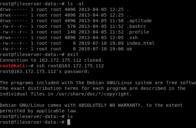 Ceux-ci sont néanmoins supprimés dès ma déconnexion. Il existe probablement plusieurs moyens de savoir que l'on est dans un environnement émulé. Le constat de suppression d'un fichier après déconnexion et la possibilité de se loguer avec plusieurs mots de passe paraissent être des choses simples, mais ce ne sont pas les premières opérations que l'on pense à mener lorsque l'on compromet un système.
