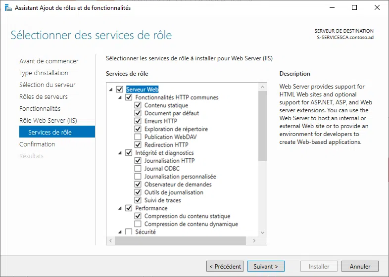 En effet, sur le serveur S-SERVICESCA, nous devons ajouter le rôle de "Serveur Web (IIS)", nous en aurons besoin pour publier la CRL et installer le service OCSP. Depuis le Gestionnaire de serveur, accédez à l'assistant d'installation des rôles et sélectionner "Serveur web (IIS)". Laissez tous les choix par défaut sur les écrans suivants, et terminez l'assistant.