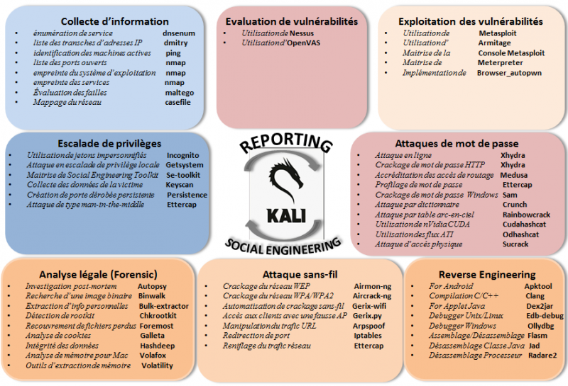 Nous allons détailler maintenant quelques-uns des outils en spécifiant leurs fonctionnalités et la façon de les utiliser. Puis, dans la mesure où certains outils supplémentaires peuvent être utiles, nous verrons comment installer ceux-ci afin de transformer la machine Kali Linux en laboratoire de tests d’intrusion. Par ailleurs, on adaptera les tests en fonction des besoins et de l’utilité des informations à récupérer. Afin d’illustrer cette deuxième partie, nous nous intéresserons aux deux suites que sont :