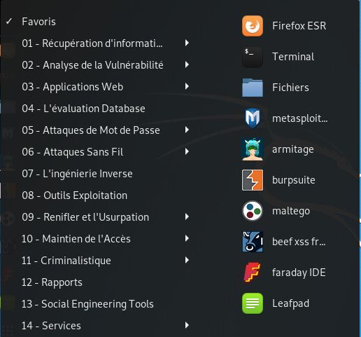 Comme nous venons de le souligner Kali Linux est une suite logicielle composée de nombreux programmes et présentant ainsi une grande quantité de fonctionnalités. Lorsque l’on ouvre le menu principal de notre station Kali Linux, nous découvrons une liste de rubriques numérotés de 01 à 14, pouvant être utilisés selon les besoins, et chacun avec ses propres outils :