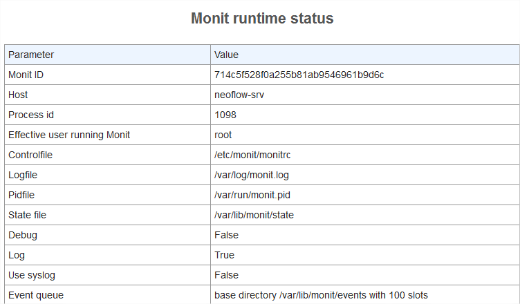 Parmi les informations, on trouve le nom de l’hôte où tourne le démon Monit, le numéro de processus, l’utilisateur qui exécute Monit, le chemin vers le fichier de configuration, la configuration e-mail, etc… Un résumé qui peut s’avérer utile pour faire le point sur sa configuration, sans aller trifouiller directement le fichier de configuration.