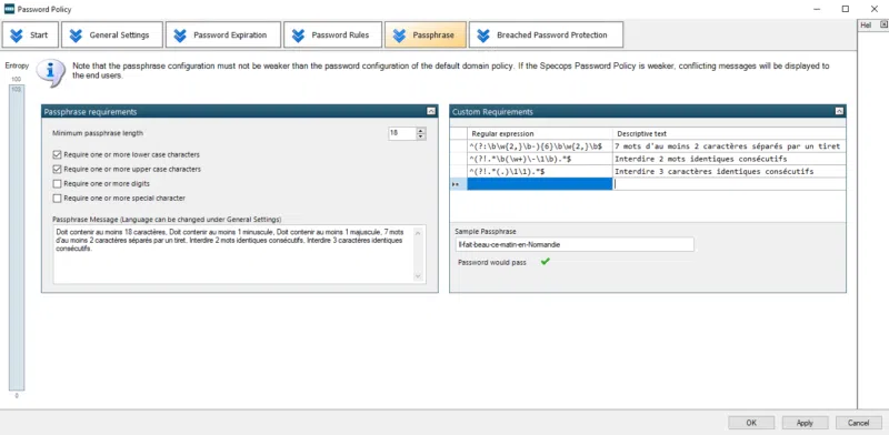Vous pouvez notamment créer des politiques spécifiques pour les passphrases et interdire l'utilisation de certains mots clés à partir d'un dictionnaire personnalisé. Ainsi, vous pouvez interdire l'utilisation de mots de passe trop simples ou de mots de passe reprenant le nom de votre organisation.
