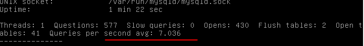 Pour information, MySQL récupère cette valeur en faisant simplement une division entre le nombre de seconde uptime et le nombre totale de requête. On peut récupérer cette valeur simplement en faisant la commande suivante en étant connecté en ligne de commande :