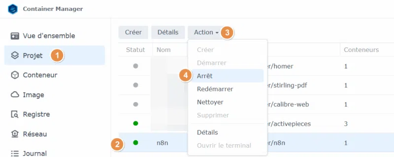 - Arrêtez le conteneur (ou le projet) n8n dans l'application Container Manager.