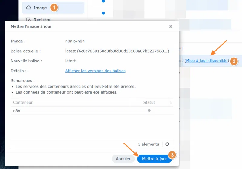 Lorsque le projet est arrêté, retournez dans la section "Image" puis cliquez sur le lien bleu indiquant qu'il y a une mise à jour. Une fenêtre va s'afficher, cliquez alors sur le bouton "Mettre à jour". Avec la ligne de commande Docker, cela reviendrait à lancer cette commande :
