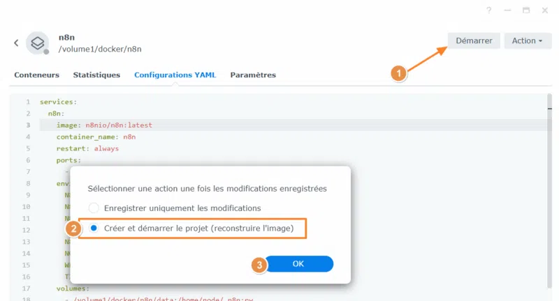 - Relancez le projet dans Container Manager, et choisissez "Reconstruire l'image" pour se baser sur la nouvelle version.