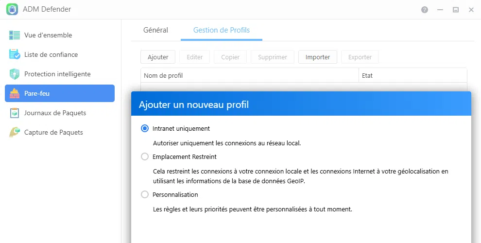 Parmi les nouveautés importantes, notons aussi une amélioration de la fonction de pare-feu : ADM Defender. Ce pare-feu intègre désormais des profils prédéfinis et personnalisables, permettant une gestion plus fine des accès réseau. La possibilité de solliciter l'API du service AbuseIPDB permet notamment de bloquer les adresses IP malveillantes de façon proactive. En complément, une fonctionnalité de capture de paquets a été introduite.