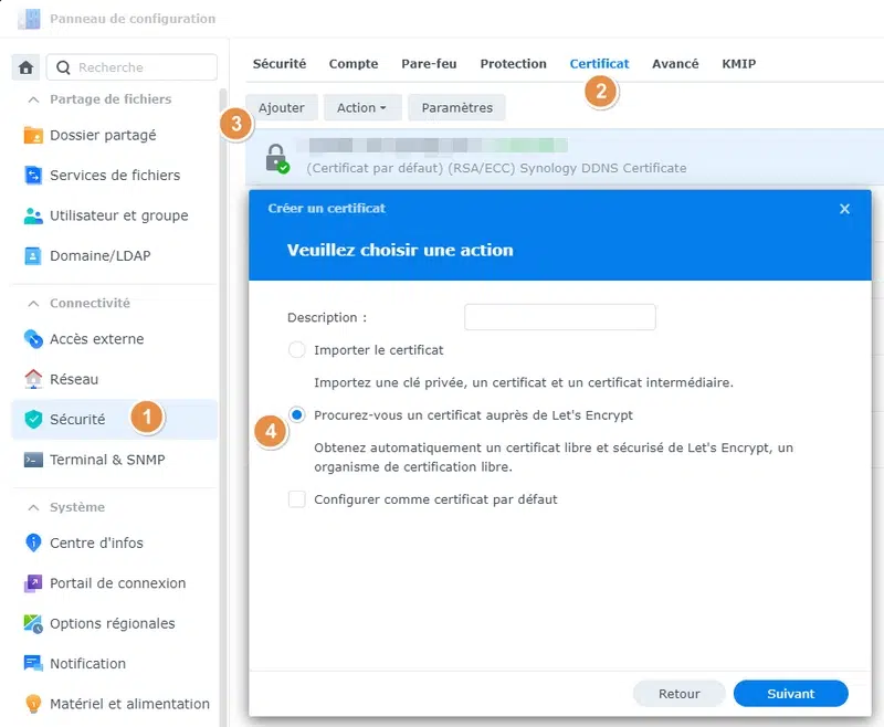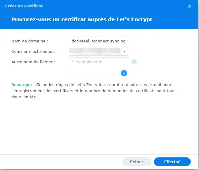 Ensuite, il sera nécessaire de demander l'obtention d'un certificat Let's Encrypt. Dans ce cas, il faut accéder à la gestion des certificats de DSM et demander un nouveau certificat Let's Encrypt pour "docuseal.itconnect.synology.me".