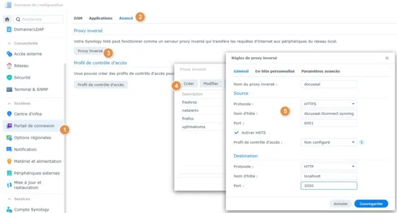 Pour que DocuSeal soit accessible depuis Internet, vous avez plusieurs options. L'une de ces options, c'est d'utiliser le reverse proxy de DSM couplé au DDNS afin de publier l'application et obtenir un certificat TLS via Let's Encrypt.