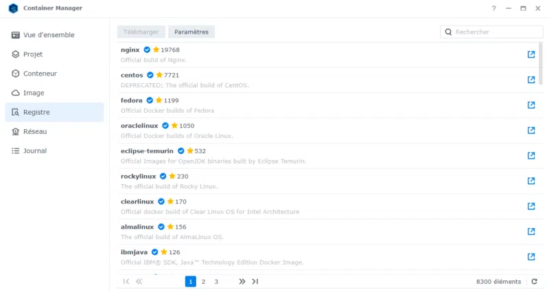 La section "Registre" donne accès à la liste des images que vous pouvez télécharger sur votre NAS et exploiter ensuite dans des conteneurs Docker. Par défaut, Container Manager s'appuie sur le dépôt officiel "Docker Hub", mais en cliquant sur le bouton "Paramètres", vous pouvez ajouter des dépôts privés. Le nombre d'étoiles indique la popularité de l'image, c'est donc un indicateur important.
