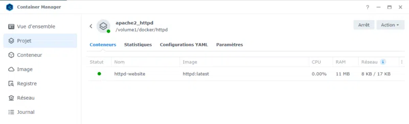 Une fois que ce sera terminé, le conteneur Apache2 sera actif et accessible. Le statut global du projet est visible dans "Projet", tandis que le statut du conteneur "httpd-website" est visible dans "Conteneur". Cette section permet d'afficher le statut par conteneur, car un projet peut regrouper plusieurs conteneurs. Dans la section "Image", celle correspondante au conteneur Apache2 a bien été téléchargée.