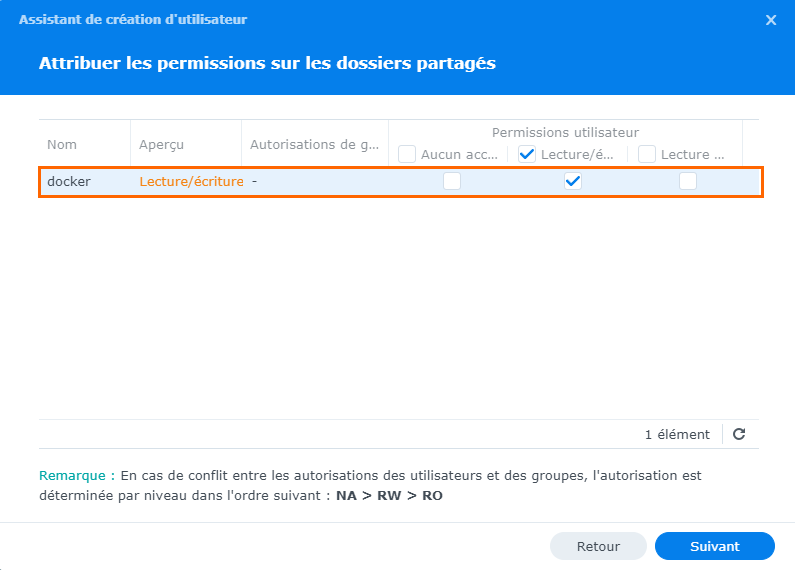 5 - Attribuer les permissions de lecture et écriture sur le dossier partagé "docker" à cet utilisateur.