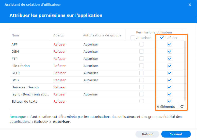 7 - Refusez l'accès, de façon explicite, à toutes les applications. Cet utilisateur n'a aucune raison d'avoir accès à l'interface DSM ou à d'autres fonctions.