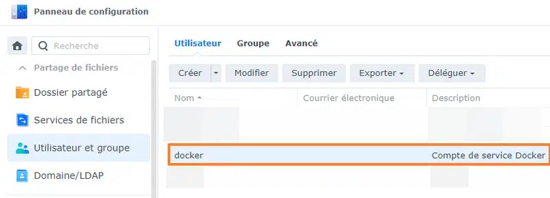 Pour des raisons de sécurité, évitez d'exécuter le conteneur avec un compte utilisateur qui est administrateur du NAS. À la place, utilisez un compte utilisateur dédié pour Docker, par exemple, nommé "docker" et qui aura des permissions de lecture et écriture sur le répertoire "docker" et son contenu. C'est tout. Il n'aura pas accès aux autres applications, ni même à l'interface de DSM.