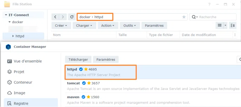 Pour que vous puissiez faire vos premiers pas avec le déploiement d'un conteneur Docker sur un NAS Synology, nous allons faire simple et déployer un conteneur basé sur l'image "httpd". Ceci correspond à un serveur web Apache2.