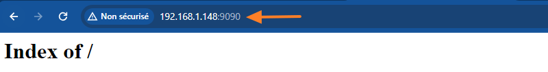 À partir d'un navigateur, il est possible d'accéder à notre serveur web Apache2. Il suffit de saisir l'adresse IP du NAS, suivie par le numéro de port 9090. Actuellement, il n'y a aucun fichier, donc la page web affiche la directive "Index of /".