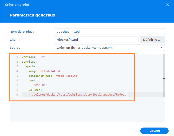 La section "Projet" est directement liée à l'utilisation de Docker Compose. Cet outil va faciliter le déploiement d'un nouveau conteneur grâce à un fichier de configuration au format YAML.