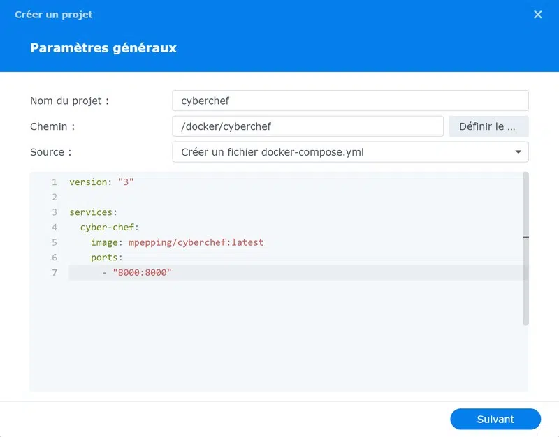 Vous devez donner un nom à ce projet, sélectionner le répertoire créé précédemment et indiquer le code de configuration Docker Compose permettant de déployer l'image officielle du conteneur CyberChef. Ce qui donne :