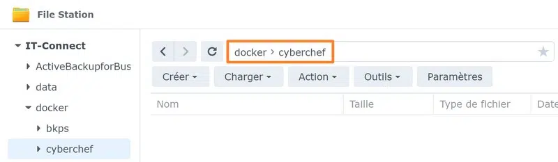 Avant toute chose, vous devez installer l'application "Container Manager" sur votre NAS, si ce n'est pas déjà fait. Puis, vous devez créer un dossier pour ce conteneur. Pour ma part, il s'agit du répertoire "cyberchef" créé sous "docker". Bien que ce répertoire soit nécessaire pour Container Manager, il n'est pas réellement utile pour CyberChef, car cette application ne stocke pas en local les données que vous lui envoyez en traitement. Les traitements sont effectués du côté client, c'est-à-dire dans le navigateur de l'utilisateur.