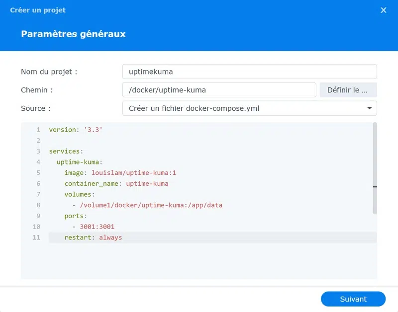 Vous devez donner un nom à ce projet, sélectionner le répertoire créé précédemment, à savoir "/docker/uptime-kuma" et indiquer le code de configuration Docker Compose. Ce qui donne :