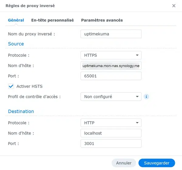 Voici la configuration à utiliser pour le reverse proxy (à adapter) et qui permettrait d'accéder à Uptime Kuma via l'URL "https://uptimekuma.mon-nas.synology.me:6001".