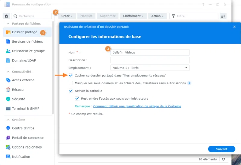 3 - Nommez ce dossier partagé, par exemple "Jellyfin_Videos". Vous pouvez aussi cocher l'option "Cacher ce dossier partagé dans Mes remplacements réseaux" puisqu'il n'a pas vocation à être consulté directement. En effet, la lecture de son contenu sera effectuée par l'intermédiaire de Jellyfin.