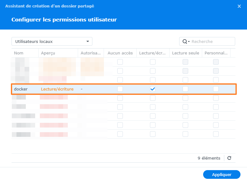 L'utilisateur "docker", qui sera associé au conteneur Docker, doit disposer de permissions sur ce partage.