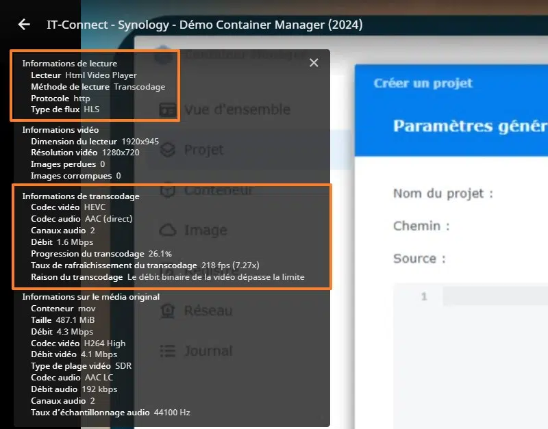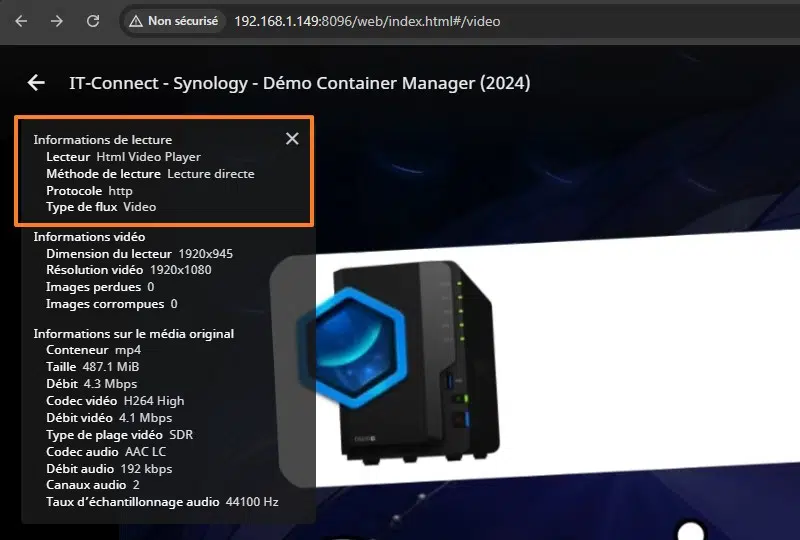 Le transcodage va être effectué par le matériel du NAS, afin de délivrer un flux adapté au navigateur du client. Ainsi, si vous retournez dans les propriétés de la lecture en cours, vous devriez voir, cette fois-ci, la mention "Transcodage". L'opération étant effectuée par le matériel, elle est beaucoup plus efficace.