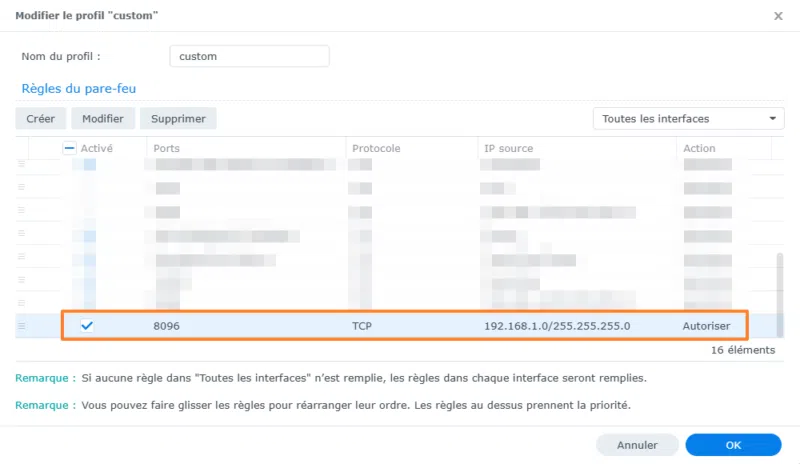 Pendant ce temps, je vous invite à accéder au Panneau de configuration de votre NAS pour créer une nouvelle règle de pare-feu (si votre pare-feu est actif et strict). Vous devez créer une règle pour autoriser les connexions sur le port 8096/TCP depuis le réseau local (nous reviendrons sur l'accès distant par la suite). Ici, le réseau "192.168.1.0/24" est autorisé.