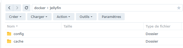 Avant de créer le conteneur en lui-même, vous devez créer un répertoire pour ses données. Ici, je crée un répertoire nommé "jellyfin" sous le répertoire principal" docker", puis à l'intérieur, je crée 2 sous-dossiers : "config" et "cache". Ce qui donne cette arborescence :