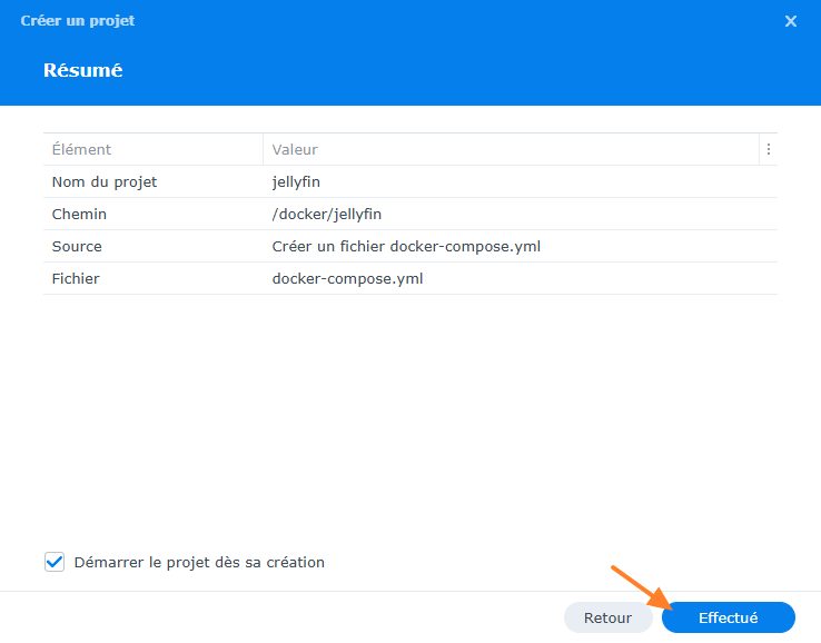 Poursuivez jusqu'à la fin dans le but de créer ce projet. Vous devez ensuite patienter, Container Manager va télécharger l'image Docker puis construire le conteneur Jellyfin.