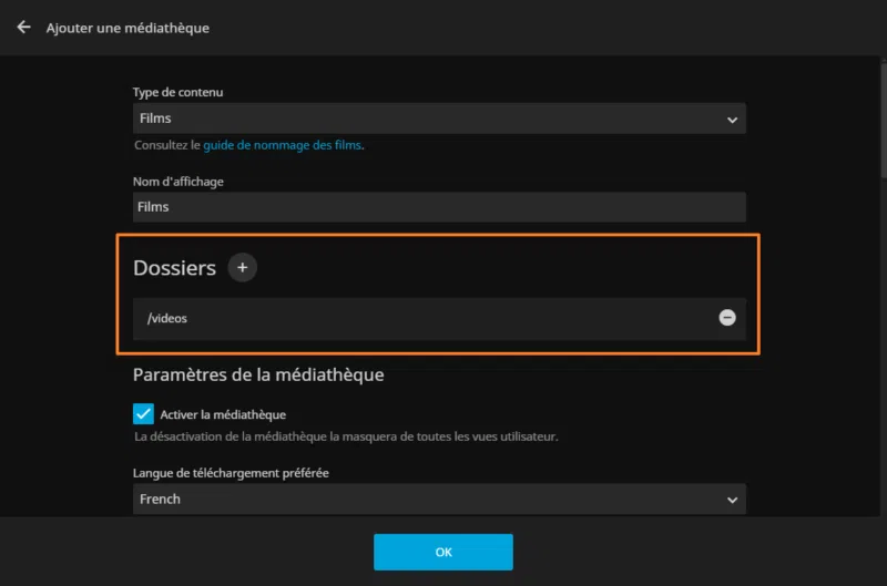 Puis, vous devez faire le lien entre cette médiathèque et les fichiers sur votre NAS. Ici, la bibliothèque nommée "Films" est liée au dossier "/videos", qui correspond en fait au répertoire "/volume1/Jellyfin_Videos" du NAS. Souvenez-vous de la déclaration effectuée dans le fichier Docker Compose.