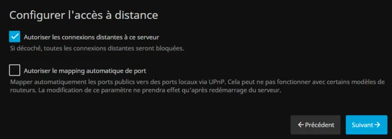 Pour autoriser les connexions distantes, notamment à partir d'un autre appareil, vous devez cocher l'option "Autoriser les connexions distantes à ce serveur". La seconde option consiste à utiliser l'UPnP pour configurer automatiquement votre box (routeur) afin d'ouvrir sur Internet votre Jellyfin. Je vous déconseille de procéder de cette façon, pour des raisons de sécurité.