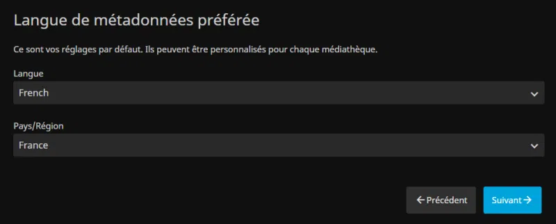 Poursuivez quand la configuration est effectuée. Sachez que vous pouvez y revenir par la suite. Sélectionnez votre langue et votre région pour les métadonnées des médias.