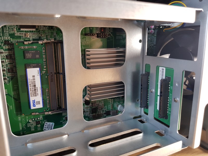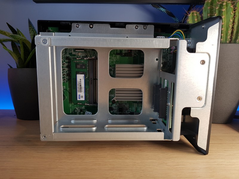 Il n'y a que deux vis à retirer à l'arrière du boîtier pour l'ouvrir complètement. L'armature intérieure est intégralement en métal et on peut voir la carte mère du NAS. C'est nécessaire d'ouvrir le NAS de cette façon pour réaliser une mise à niveau de la RAM, pour passer à 4 Go ou 8 Go, par exemple. Alors que l'extérieur est en plastique, un aperçu de l'intérieur du NAS est rassurant ?