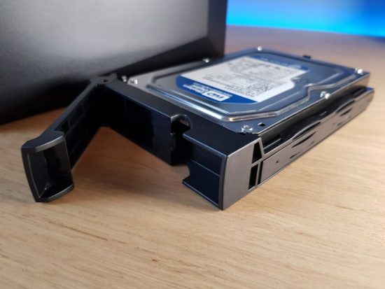 Après avoir retiré la façade aimantée, il faut sortir les deux baies pour installer les disques durs. Il n'y a pas besoin d'outils si vous installez des disques durs 3,5 pouces. Pour les disques 2,5 pouces, il faudra utiliser les vis fournies.