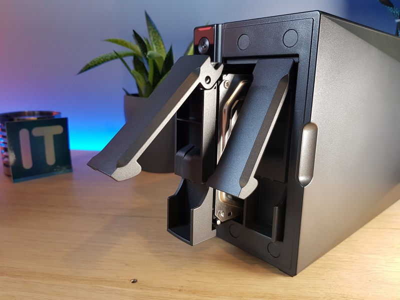 L'accès aux baies de disque s'effectue très simplement : la façade du NAS se retire (toute la partie droite). Pas besoin de sortir les outils, il s'agit d'une façade aimantée, ce qui est plutôt ingénieux et permet d'avoir un très joli rendu au niveau de la finition. Ainsi, la façade s'enlève et se remet très facilement, je n'ai pas rencontré de difficulté à repositionner la façade, avec les aimants c'est impeccable.