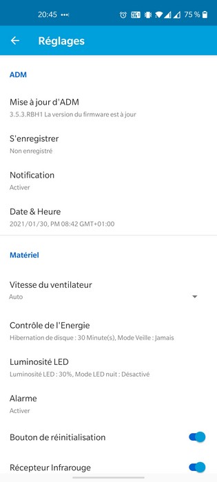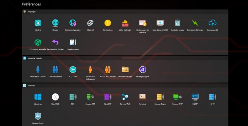 Dernièrement, ASUSTOR avait ajouté à son interface un nouveau menu nommé "Préférences", accessible en cliquant sur le bouton en haut à droite de l'interface et qui donne un accès rapide aux fonctions essentielles. Ce menu est appréciable, car il est plus ergonomique et évite de rechercher dans chacun des menus de configuration (Réglages, contrôles d'accès et services).