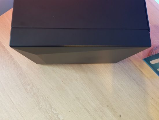 Le NAS est entièrement noir, avec une façade brillante et quelques touches de rouge, par exemple sur le logo ASUSTOR en façade ou encore à l'intérieur des ports RJ45 à l'arrière. Les surfaces de la façade et des deux côtés ne sont pas plates, elles sont en relief, en forme de diamant, ce qui donne un effet 3D très sympa. De par ses couleurs, le noir et le rouge, et son design travaillé, il me fait penser au monde du gaming.