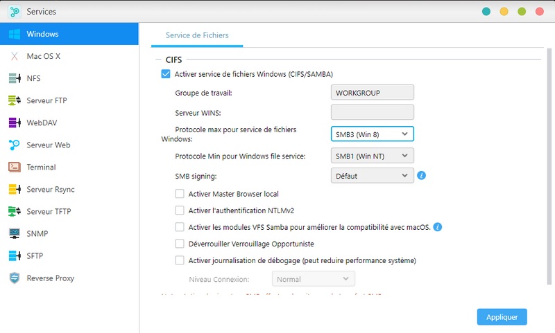 Suite à l'installation, le système ADM est accessible avec ses fonctionnalités de base. Ceci va nous permettre de mettre en place facilement des partages de fichiers, avec une gestion d'utilisateurs et de groupes. D'ailleurs, plusieurs protocoles sont supportés pour le partage de fichiers : NFS, FTP, WebDAV, SMB, SFP, l'AFP (MacOS), Etc... Nous retrouvons aussi d'autres protocoles comme le SNMP.