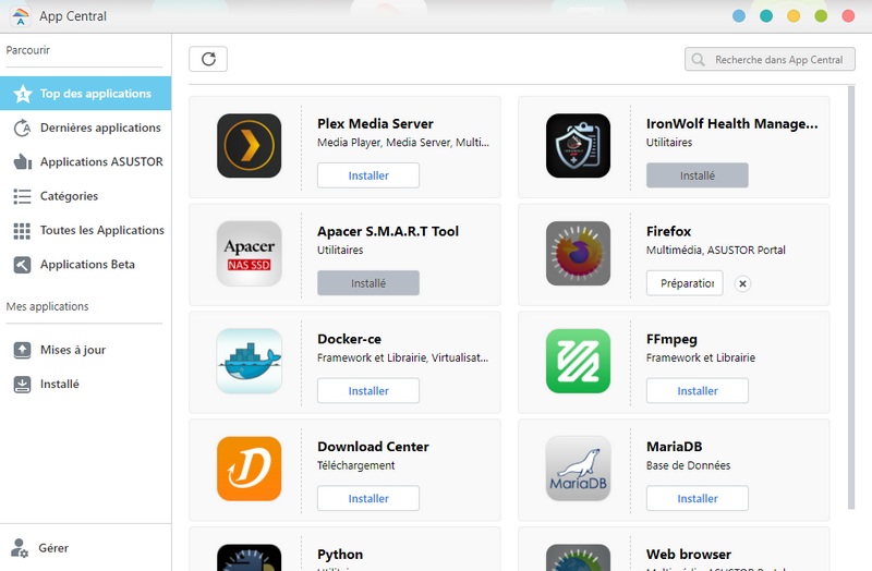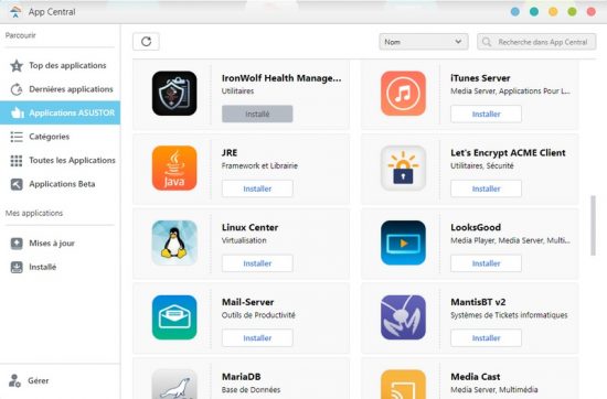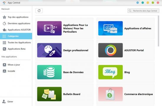 Ensuite, il faudra se tourner vers l'App Central : un magasin d'applications, qui contient à la fois des applications développées par ASUSTOR et des applications proposées par des développeurs tiers. Ainsi, grâce à ce magasin d'applications, le NAS va pouvoir être configuré aux petits oignons en fonction de ce que vous avez besoin de faire :