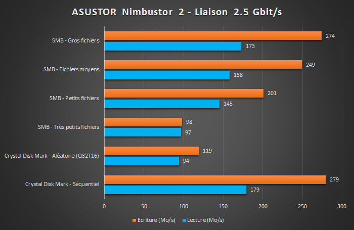 En tenant compte des graphiques ci-dessus et des relevés complémentaires que j'ai pu faire, je dirais que la connexion Ethernet 2,5 Gbit/s apporte un gros plus ! Il suffit de comparer les deux graphiques pour s'en convaincre, surtout sur les petits fichiers où le débit reste intéressant : un point positif.