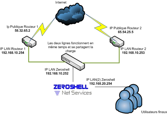 On voit donc qu'à ses sorties sur le réseau LAN routeur, Zeroshell utilise les deux lignes (les deux chemins) possibles pour sortir sur Internet. Le traitement est donc plus rapide, car la charge est répartie sur plusieurs éléments actifs au lieu d'être traités dans une seul fil d'attente. Aux yeux des utilisateurs en revanche, l'opération est invisible, car ils ne voient toujours comme seule passerelle vers Internet l'IP "LAN utilisateurs" du Zeroshell (192.168.10.252). Le souci étant que si une des deux lignes tombe, la répartition des charges serait compromise, car un paquet sur deux (sur une répartition des charges simple) serait perdu. C'est pour cette raison que Zeroshell mettra toujours en place un Load Balacing couplé à un Fail Over .