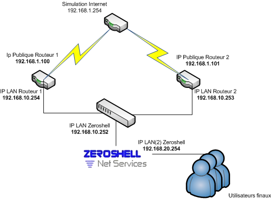 Dans le cadre de notre tutoriel, nous allons faire en test "en interne". Nous aurons deux routeurs Linux avec deux interfaces, une "eth0" qui ira vers un "WAN" en 192.168.1.0/24 et une "eth1" qui ira vers un "LAN routeur" en 192.168.10.0/24. Notre Zeroshell aura lui aussi deux interfaces, une "eth0" vers notre "LAN routeur" et une autre "eth1" vers un "LAN users" en 192.168.20.0/24. Enfin, une simple box pourra faire office "d'Internet". Il sera plus simple de comprendre cela avec ce schéma :